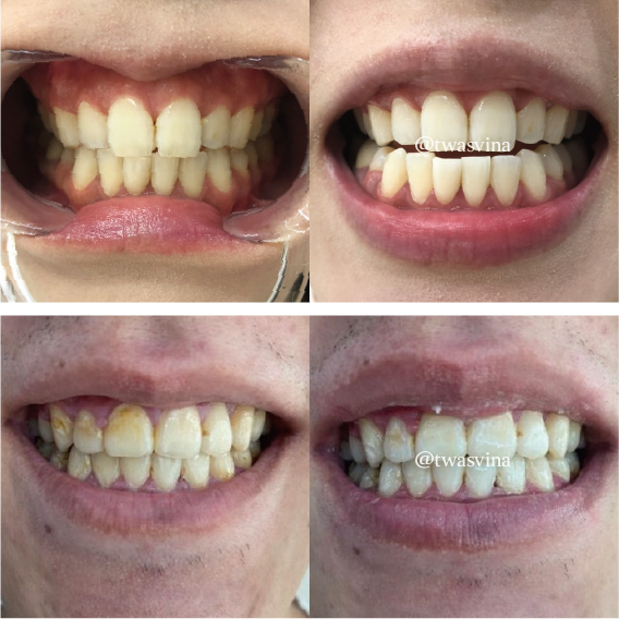 從前後對比可以看出,原本的齒色黃垢多,使笑容的清潔度與明亮感不足。經過淨白牙齒保養後,牙齒的色澤變得更透亮、視覺上更乾淨,使整體笑容更顯清新自然。