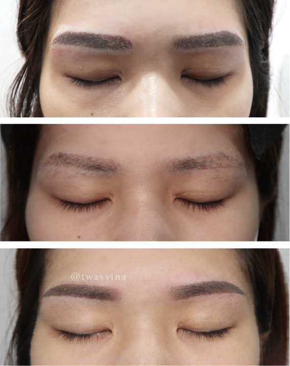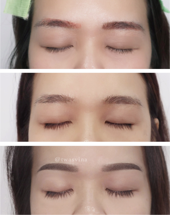 從前後對比可以看到,原本的眉毛因早期色料沉底或技術不良,出現明顯的橘紅眉問題,讓眉型看起來不自然,甚至影響整體氣質。色偏、殘眉或暈染的情況,使眉部輪廓模糊、顏色暗沉,越退越醜。